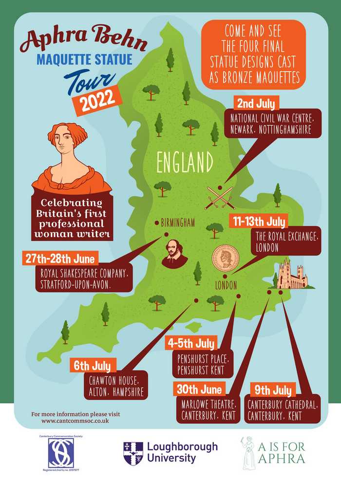 The four shortlisted designs for the Aphra Behn statue have been revealed. The shortlisted artists (l-r in image above), Christine Charlesworth, Meredith Bergmann, Maurice Blik and Victoria Atkinson have each produced a scale statue of 50cm high in bronze. The statues will be on tour across the UK at the following locations this summer.